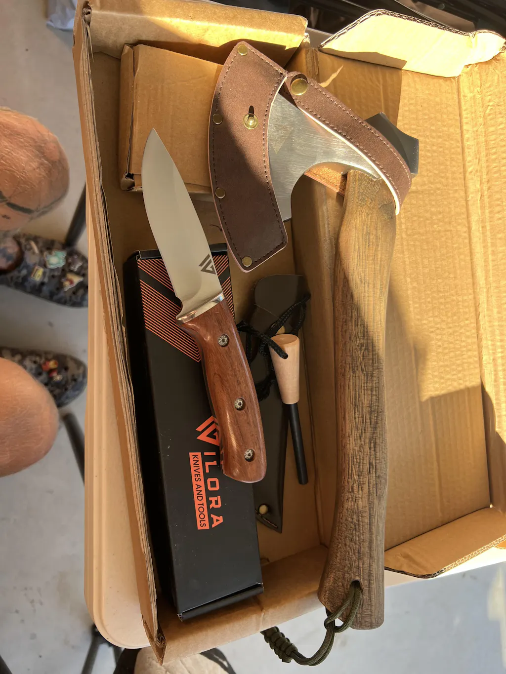 Wilora Wooden Axe Kit - Includes Camp Axe, Hunting Knife, Sharpening Stone and Ferro Rod Flint